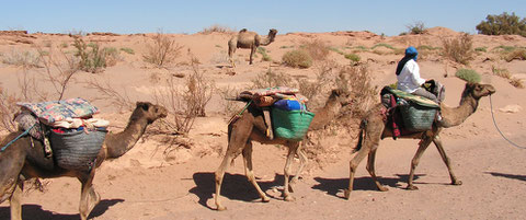 Wer möchte, kann am Ende mit in die Wüste kommen. Nach dem Besuch einer Töpferei in Tamgroute erwarten uns Dromedare für einen zweitägigen Wüstenritt. Zwei Wüstennächte verbringen wir in Zelten. Man kann auch zwei Tage in einem Wüstenhaus leben, den Ausblick auf die Wüste genießen oder in den Dünen spazieren gehen.